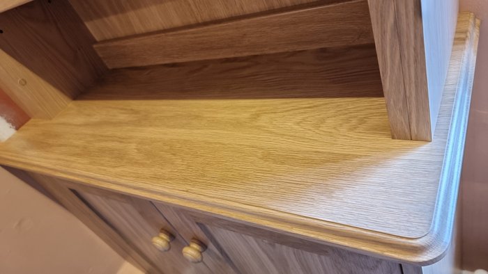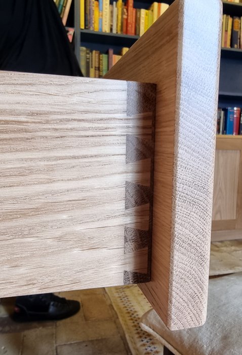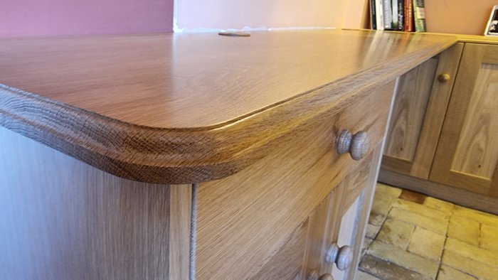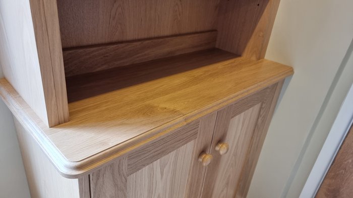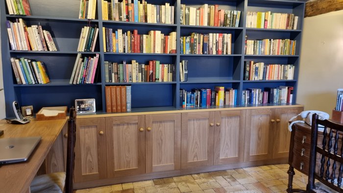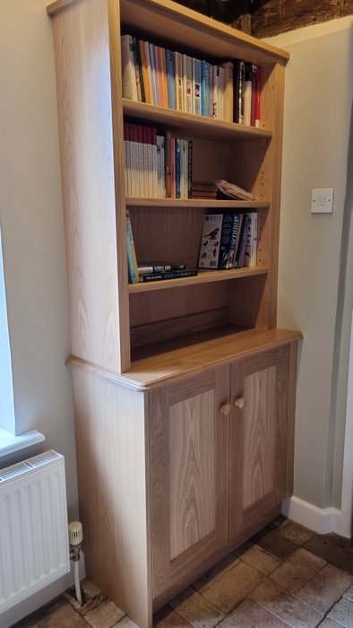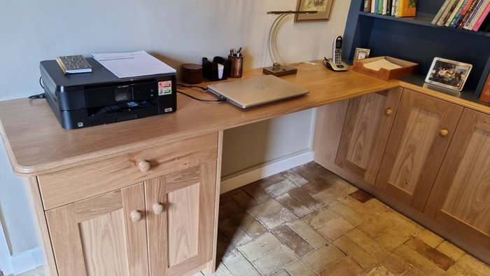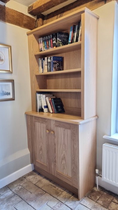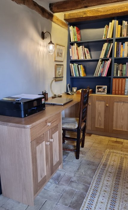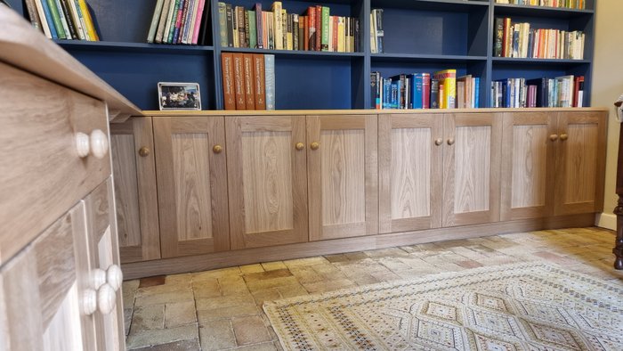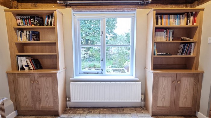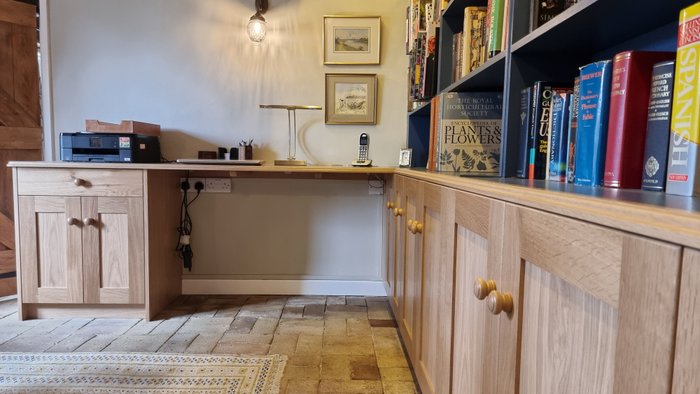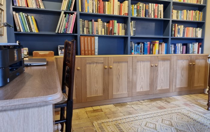 We thoroughly enjoyed transforming this room with a bespoke handcrafted oak study. The painted bookcase was already a built in feature, but had open shelving to floor level which we modified with the addition of solid oak soft closing doors, a moulded oak lipping just above the doors and an oak plinth to tie the new oak elements of this section together. The desk top was crafted from solid oak, and the cabinet supporting the left end of the work surface was a new bespoke addition too. This cabinet was complimented with a solid oak dovetail drawer, storage cabinet below, and a hidden space behind for a briefcase. In addition to the desk area, we also handcrafted two bespoke oak bookcase cabinets to position either side of the central window. These were handmade within keeping of the rest of the new oak furniture, with cupboards at the base and each fitted with soft closing double doors. A solid oak top surface and open adjustable shelving above. If you're looking to transform a space in your home, please get in touch to tell us about your project ideas.